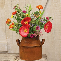 The Rusty Tin Wide Milk Can is a decorative metal milk can with a rusted finish. The classic design completes rustic farmhouse decor and can hold flowers, picks, or other elements. The can is lightweight and features a flat base for stable display on a shelf or tabletop. Measures 6.5" high by 6.25" in diameter.