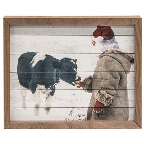10"x8" Santa and Calf Framed Print is a freestanding wood sign with a festive holiday print. It depicts a cow eating out of the hand of Santa and it has a lath look for rustic detail. Print has a natural wood frame and it looks great displayed on shelves, mantels, and tabletops. Measures 8" high by 10" wide. Made in the USA.