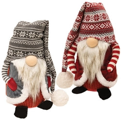 Santa Gnomes bring a cozy accent to classic winter decor. The gnomes each feature a dimensional white and gray beard, beige button nose, and black shoes. One wears a gray cloak and gray fair isle hat complete with a white pom ball accent. One wears a red cloak and red fair isle hat with a white pom ball accent. The gnomes have striped arms and are freestanding for stable display on a flat surface. Each measures 30” high. Please note: This Item features a variety of designs which are each sold individually (not as a set). Please add a note in your cart to indicate your preference. If no style is specified, one will be selected at random by our team.
