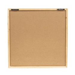 The Santa with Lantern Mirror Framed Print is a vintage inspired wall art piece crafted with seasonal Christmas style. With a distressed silver mirror background, the art features printed design depicting Santa in his classic red suit with a long white beard. Santa is shown holding a glowing green lantern and a rustic brown cane adorned with a pine, leaf, and berry cluster. A light, natural wood frame holds the print and 2 sawtooth hangers allow for easy display. Measures 16” high by 16” wide by 1” deep.