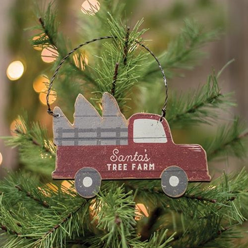 Santa's Tree Farm Truck Ornament is a wooden ornament of a red pickup truck that hauls a load of Christmas trees. The side of the truck displays, "Santa's Tree Farm." hangs on a twisted wire hanger and measures 4" wide by 2¾" high (4¼" high including hanger).