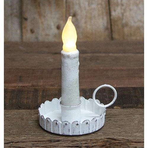 Shabby Chic Scalloped Taper Holder is a painted metal accent with a distressed white finish, fluted candle pan, and a round loop handle for carrying. This candle holder looks great on shelves, counters, and side tables and it complements a variety of taper colors. Measures 1.75" high by 3.25" wide by 3" deep.