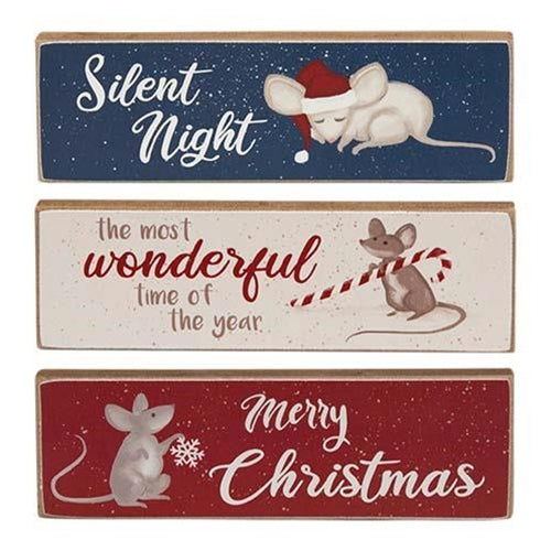 The Silent Night Mouse Blocks are an assortment of three miniature wooden blocks with a Christmastime theme. The blocks have an assortment of colorful speckled backgrounds and feature mouse artwork, festively displayed with a Santa hat, candy cane, or snowflake. The blocks have sweet Christmas messages, reading "Silent Night", "Merry Christmas", or "the most wonderful time of the year" in scripted lettering. Display these blocks freestanding on a riser, windowsill, shelf, or tabletop for a charming rustic addition to the home during the holidays. Each block measures 1.5" high by 5" long by .5" deep. Please note: This Item features a variety of designs which are each sold individually (not as a set). Please add a note in your cart to indicate your preference.