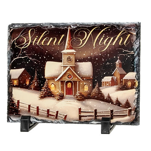 The Silent Night Photo Slate is a unique art piece perfect for festive shelf or tabletop display. The slate is cut into a rectangular shape with rough edges for a rustic look. Printed design depicts a country scene starring a small church, shown with warm light peeking through its windows. Bare trees and a dark sky serve as the image’s background, with snow and evergreen trees adding a wintry look. A wooden fence crosses the front of the design, and white snowflakes are scattered all over the piece. Golden script text across the top of the slate reads, “silent night.” The slate includes a pair of black feet for easy display. Measures 5.5” high by 7.5” wide by .25” deep.