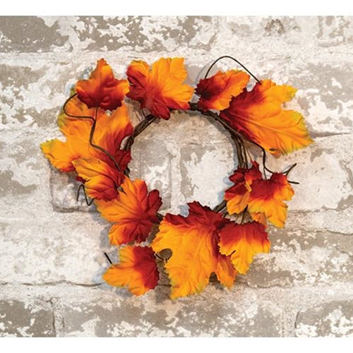 Silk Maple Leaves Ring is a vibrant fall floral that features ombre silk fabric leaves on a brown-wrapped base. Leaves have green tips that fade into orange and burgundy for an autumnal feel. Pair with a pillar candle for a complete look. Measures 3.5" inside diameter and 9" outside diameter.