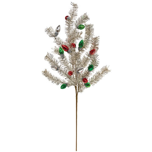 The Silver Tinsel & Holiday Bulbs Spray adds a shining seasonal accent to a festive arrangement. Built on a flexible brown wrapped stem, the spray features silver tinsel branches. Metallic holiday bulbs in silver, red, and green accent the tree. Measures 33” high by 6” wide by 1.5” deep.