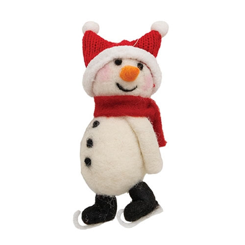 The Skating Snowman Felted Ornament makes a playful addition to festive seasonal decor. The ornament depicts a snowman with a white felted finish and a detailed face made up of black beads, embroidery, and an orange plush carrot nose. A red knit hat, coordinating red scarf, and classic black ice skates complete the look. The figure can stand on a surface or hang from a holiday tree. Measures 5” high by 3” wide by 2.5” deep.