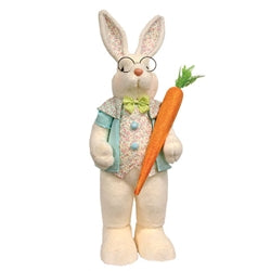 Please note: This Item features a variety of designs which are each sold individually (not as a set). Please add a note in your cart to indicate your preference. If no style is specified, one will be selected at random by our team (based on availability). Standing Spring Floral & Eggs Bunnies are large freestanding figures made with sweet springtime styles. The fluffy white rabbits each stand on sturdy feet and feature tall sculpted ears lined with cream floral fabric and outlined in glittery rickrack. Available in 2 assorted styles, each bunny has black bead eyes and a pink felted triangle nose. One rabbit wears a cream dress with a pink and blue floral print, complete with a Peter Pan collar, iridescent buttons, and a sheer apron skirt. A colorful flower crown sits between her ears and she wears a light green bow tie. One bunny wears a cream shirt with a blue and pink floral print and glittery blue buttons layered under a light blue shirt. He holds a large glittered orange carrot and wears black wire glasses and a light green bow tie. Each measures 30” high by 10” wide by 8” deep.