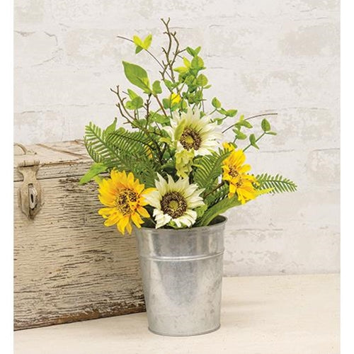 16" Summer Summit Pot is a faux plant that features cream and yellow fabric flowers and a mix of greenery. This arrangement sits in a galvanized metal pot that has been filled with a bed of decorative moss and soil and its size makes it ideal for display as a centerpiece, on a bookshelf , or along a windowsill. This floral effortlessly brings color and texture to a room and it measures 16" high by 4.5" wide (10" with foliage fanned out).