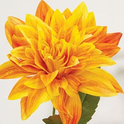 The Sunrise Dahlia Stem brings a bold floral accent to spring, summer, or everyday decor. The pick features a long green stem with dimensional coloring for a realistic look. Detailed green leaves with red touches and a smooth finish sprout from the branches along with a bright orange and yellow flower. The stem makes a perfect addition to a decorative floral display. Measures 27” high by 7” in diameter.