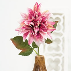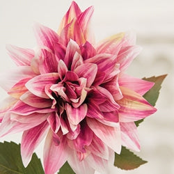 The Sunset Dahlia Stem brings a bold floral accent to spring, summer, or everyday decor. The pick features a long green stem with dimensional coloring for a realistic look. Detailed green leaves with red touches and a smooth finish sprout from the branches along with a dark pink, light pink, and cream flower. The stem makes a perfect addition to a decorative floral display. Measures 27” high by 7” in diameter.