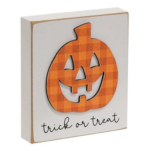 The Trick or Treat Block is a decorative wooden block with a white finish and natural worn edges. The block reads "trick or treat" in black script lettering and features a wooden jack-o-lantern cutout with an orange plaid pattern. Display this block freestanding, placed on a riser, tray, shelf, counter, or table for a fun and festive addition to Halloween decor in the home. Measures 4" high by 3.5" wide by .75" deep.