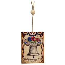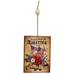 Please note: This Item features a variety of designs which are each sold individually (not as a set). Please add a note in your cart to indicate your preference. If no style is specified, one will be selected at random by our team. Vintage Americana Sunshine Ornaments add a touch of Americana to a holiday tree or hanging decor. Crafted from wood chip board, the ornaments each depict a patriotic floral scene. The vintage inspired designs each feature a weathered look and unfinished backs and sides. One ornament depicts an American flag waving in the center of a sunflower wreath surrounded by text that reads “America, stars, stripes and sunshine.” One showcases the Liberty Bell topped with mini flags and red and blue flowers with text that reads “Independence 1776”. One ornament features a red, white, and blue floral bouquet accented by cherries and mini flags, with text that reads “United States of America” and a banner that reads “1776, Independence Day.” A jute string hanger accented by a white wood bead allows for versatile display. Each measures 4” high by 3” wide by .13” deep. Made in the USA!