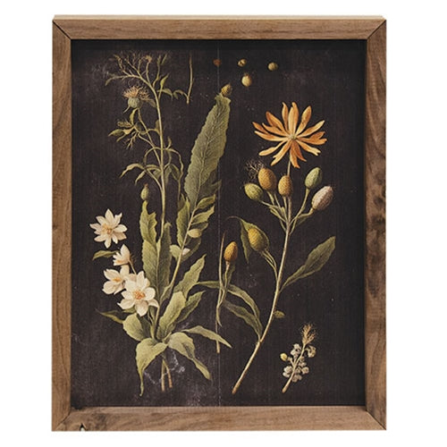 The Vintage Cream Floral Framed Print is a unique art piece in a natural wood frame. The art piece features a black background and shows a range of plants in a field guide-inspired arrangement. The frame is freestanding for stable display on a flat surface, or can be added to a decorative wall display. Measures 10.75" high by 8.75" wide by 1.5" deep.