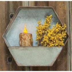 Hang this Vintage Galvanized Hexagon Pocket to put your keys or flowers in. This is a galvanized metal storage unit with a unique hexagon shape and a lightly distressed, rusty finish. The shelf has a lip barrier for added security. Get two or three of these hexagon pockets and place them on one way to make a stunning wall display. Hangs on two d-ring loops. Measures 10¼" high by 11¾" wide and 2¾" deep with a 3½" high barrier.