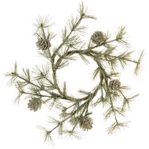 Vintage Glitter Birchcone Pine Ring is a winter floral that features heavily glittered, icy pine branches and mini pinecones on a brown-wrapped floral ring base. Pair with a battery-operated pillar candle for a classic Christmas display that looks great displayed throughout the winter season. Measures 3.5" inside diameter and 11" outside diameter.