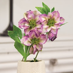 The Violet Scabiosa Spray brings a bright floral accent to springtime or anytime decor. The spray features a long green stem with a textured finish and dimensional coloring for a realistic look. Detailed green leaves with a glossy finish sprout from the branches along with flowers featuring rich purple edges that fade to pale green centers. The flowers are shown in various states of bloom. The spray makes a perfect addition to a decorative floral display. Measures 25” high by 8” wide by 3” deep.