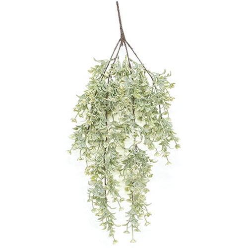 The White Star Lavender Bush is a decorative floral hanging bush with a natural brown twig base. The bush features long, trailing stems of white star lavender blooms in a soft, dusty light green color. Display this piece hanging on a wall or door, or laid across a table or shelf, woven among tabletop décor for a simple and lush greenery accent in the home.
