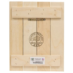 The Winter Welcome Cow Pallet Art is a festive decor piece featuring natural wood pallet planks. The design depicts a cow with long cream colored hair looking over a wooden fence. He wears a sweet expression with a classic red and white Santa hat and a red plaid scarf. Evergreen trees stand in the background, and snow falls over the scene for a wintry look. Dark gray text reading “winter welcome” in a mix of fonts sits above the cow. The back of the art features a sawtooth hanger for easy wall display. Measures 11.75” high by 9” wide by .75” deep. Made in the USA!
