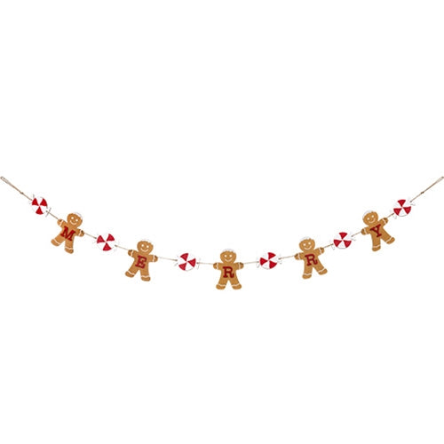 The Wooden Merry Gingerbread & Peppermint Garland brings a sweet seasonal accent to decorative holiday displays. Strung on jute twine, the garland features cutout gingerbread men separated by cutout peppermint candies. The gingerbread men have a natural wood color painted with white icing-inspired details and red cutout letters that spell “merry.” The peppermint candies have a classic white and red look. A hanging loop at each end of the garland allows for easy display. The garland measures 60” long. Each gingerbread man measures 5” high by 3.75” wide by .25” deep, and each peppermint measures 2.25” high by 3” wide by .25” deep.