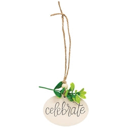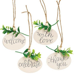 Wooden Oval Floral Love Tags bring an elegant accent to special occasion decor. Made from wood, each tag features an oval shape and is accented by a sprig of faux greenery. In gray text with a script font, one tag reads “welcome,” one reads “with love,” one reads “celebrate,” and one reads “thank you.” A jute hanging string completes each tag along with a white wooden bead accent. Each measures 2” high by 3.25” wide by .25” deep. Please note: This Item features a variety of designs which are each sold individually (not as a set). Please add a note in your cart to indicate your preference. If no style is specified, one will be selected at random by our team.