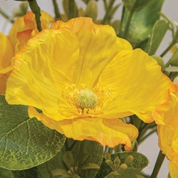 The Yellow Poppy & Wildflower Bush accents indoor decor with realistic faux floral style. A green-wrapped stem sprouts a cluster of flexible green branches. Detailed, realistic green leaves adorn the branches along with bright yellow and golden blooms. Small plastic green and white flowers complete the look. Measures 22” high by 6” in diameter.